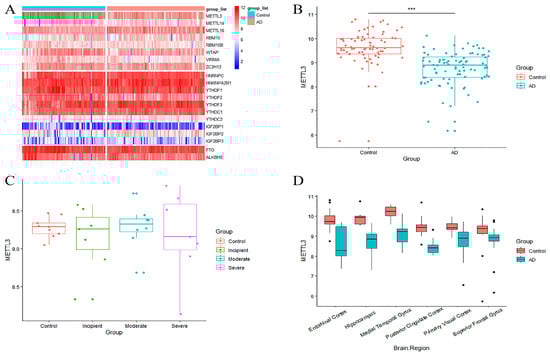 Identification of differential genes between AD patients and controls. (A) Heat map of differential expression for 20 m6A regulators in GSE5281, divided from top to bottom according to m6A writer, erasure, and reader genes. (B,C) Differential expression boxplot of METTL3 in GSE5281 and GSE1297. There were noticeable alterations in METTL3 during the severe stage of AD in (C). Patients are categorized as control, incipient, moderate, and severe according to their degree of pathology sequentially for GSE1297. (D) Differential expression boxplot of METTL3 in different brain regions in GSE5281. METTL3 expression was markedly decreased in the entorhinal cortex, hippocampus, and medial temporal gyrus. (*** refers to the significance mark of the difference).