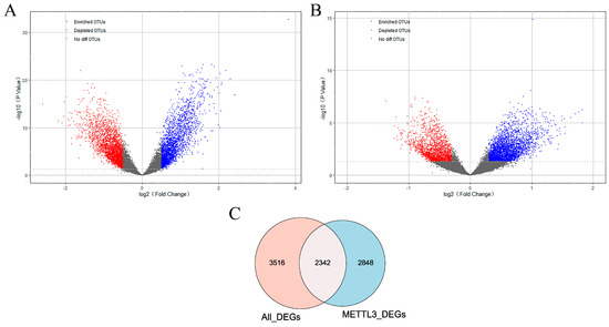Identification of METTL3-related AD genes. (A,B) Volcano diagram of DEGs (|log2FC| > 0.3 and p value < 0.05). DEGs between AD patients and controls and between METTL3_high and METTL3_low subgroups were included. Up-regulated genes were in red and downregulated genes were in blue. (C) Venn diagram showed that there were 2342 overlapping genes in All_DEGs and METTL3_DEGs. Namely, METTL3-related AD genes that were correlated with METTL3 and significantly differentially expressed in AD.