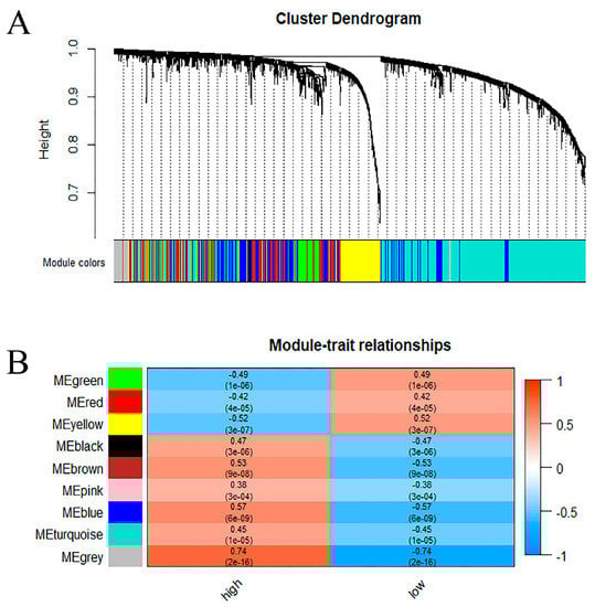 The set of AD genes most positively correlated with METTL3 in AD. (A) A dendrogram of METTL3-related AD genes, clustered under different degrees of similarity. (B) Heat map of correlation between 9 modules and METTL3 expression status. The numbers were the correlation coefficients and their corresponding confidence levels.