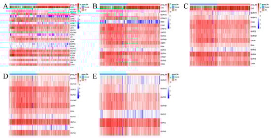 Heat map expression of pathway genes. (A–E) From left to right, the selected pathways were the ATP metabolic process, oxidative phosphorylation, mitochondrial ATP synthesis coupled electron transport, oxidoreductase complex, and NADH dehydrogenase complex.