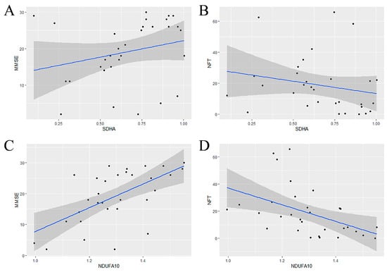 Validating the role of SDHA and NDUFA10 in AD. (A,B) From left to right, the association of SDHA expression with MMSE and NFT, respectively. (C,D) From left to right, the association of NDUFA10 expression with MMSE and NFT, respectively. When NDUFA10 was lowly expressed, MMSE values decreased and NFT values increased, indicating aggravation of AD.