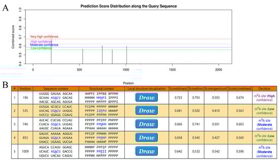 The SRAMP online database (http://www.cuilab.cn/sramp, accessed on 6 September 2022) was applied to further verify whether the candidate gene and METTL3 can constitute an m6A-dependent mechanism. By predicting the precise location of m6A modifications on the candidate gene, SRAMP can provide a confidence level for each modification.