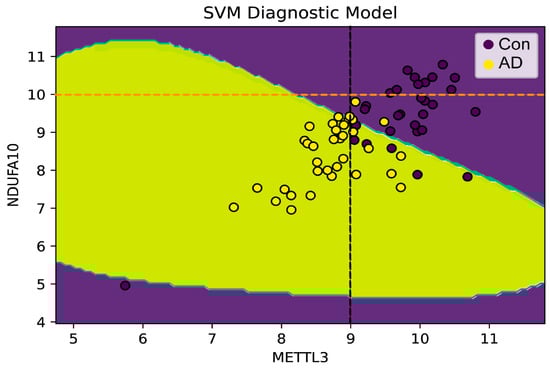 Finally, we constructed a diagnostic model of AD using METTL3 and NDUFA10 to validate our speculation. The SVM diagnostic model reconfirmed that the combination of METTL3 and NUDFA10 had a significant role in the progression of AD. More importantly, the threshold of METTL3 expression level presents a promising novel thought for the future detection of AD. The cross-validation results showed a high AUC value. This implies that our model may provide a fresh perspective for the diagnosis of AD. In addition, the m6A modification mechanism between METTL3 and NDUFA10 was further validated by the SRAMP online site.
