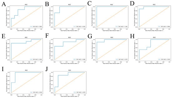 Validation of the model classification effect. (A–J) ROC curves. AUC represents the area under the ROC curve. When 0.5 < AUC < 1, the model shows a great classification effect and holds predictive value. The training and test sets were randomly divided ten times by cross-validation. The predictive performance of the SVM diagnostic model was evaluated in AD by calculating the average of ten AUC values.