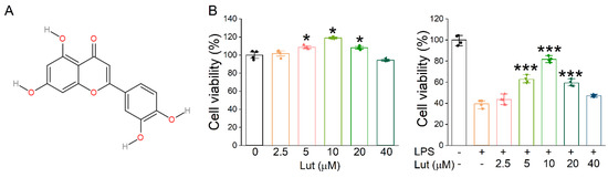 Effects of Lut on cell proliferation inhibited by LPS. (A) The molecular structure of Lut. (B) Left panel: Cell viability was detected after incubation with Lut (0, 2.5, 5, 10, 20, and 40 μM). * p < 0.05, compared with 0 μM group, n = 4. Mann–Whitney U test was used to analyze the difference of the means for significance. Right panel: Lut induced LPS-inhibited primary AT2 cell proliferation. *** p < 0.001, compared with LPS group, n = 4. One-way ANOVA followed by Bonferroni’s test was used to analyze the difference of the means for significance.
