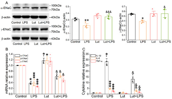 Lut increased the expression levels of ENaC and inhibited inflammation in primary AT2 cells. Cells were treated with Lut (10 μM, 24 h), co-presence or absence of LPS (10 μg/mL, 12 h). (A) Representative Western blot and corresponding graphical representation of data obtained from Western blot assays for α/γ-ENaC in primary AT2 cells, where bands were quantified using gray analysis (α, γ-ENaC/β-actin). * p < 0.05, ** p < 0.01, compared with Control group. & p < 0.05, &&& p < 0.001, compared with LPS group, n = 4. One-way ANOVA followed by Bonferroni’s test was used to analyze the difference of the α-ENaC means for significance. Mann–Whitney U test was used to analyze the difference of the γ-ENaC means for significance. (B) The expression levels of α/β/γ-ENaC mRNA were examined by real-time PCR with GAPDH set as the internal standard. * p < 0.05, *** p < 0.001, compared with Control group. & p < 0.05, compared with LPS group, n = 4. Mann–Whitney U test was used to analyze the difference of the α/γ-ENaC means for significance. One-way ANOVA followed by Bonferroni’s test was used to analyze the difference of the β-ENaC means for significance. (C) IL-1β, IL-6, and TNF-α levels in primary AT2 cells. * p < 0.05, *** p < 0.001, compared with Control group. & p < 0.05, && p < 0.01, compared with LPS group, n = 4–5. Mann–Whitney U test was used to analyze the difference of the IL-1β means for significance. One-way ANOVA followed by Bonferroni’s test was used to analyze the difference of the IL-6/TNF-α means for significance.