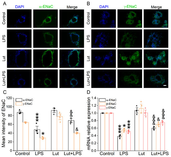 Effect of Lut on ENaC expression in 3D organoid culture. (A,B) Immunofluorescence staining showed the effect of LPS and Lut on the expression of α/γ-ENaC in 3D organoid culture. Scale bar, 50 μm. (C) Statistical diagram of α/γ-ENaC protein expression. * p < 0.05, *** p < 0.001, compared with Control group. & p < 0.05, && p < 0.01, compared with LPS group, n = 4. One-way ANOVA followed by Bonferroni’s test was used to analyze the difference of the α-ENaC means for significance. Mann–Whitney U test was used to analyze the difference of the γ-ENaC means for significance. (D) The expression levels of α/β/γ-ENaC mRNA were examined by real-time PCR in 3D organoid culture. * p < 0.05, *** p < 0.001, compared with Control group. & p < 0.05, &&& p < 0.001, compared with LPS group, n = 4. One-way ANOVA followed by Bonferroni’s test was used to analyze the difference of the α/γ-ENaC means for significance. Mann–Whitney U test was used to analyze the difference of the β-ENaC means for significance.