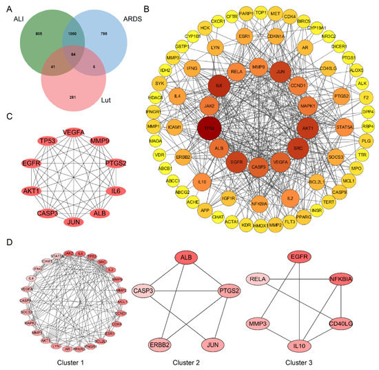 A total of 412 putative gene targets and 1980/1935 disease gene targets related to Lut and ALI/ARDS, respectively, were obtained, and the duplicates were removed. The protein targets were transformed to gene targets by the UniProt database. The intersection of putative Lut and ALI/ARDS disease targets resulted in 84 overlapping genes (Figure 6A), which were related to the Lut involvement of ALI/ARDS.