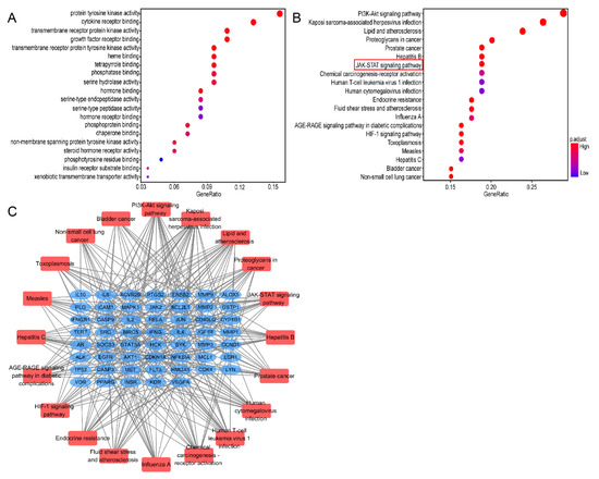 GO and KEGG analysis of 80 common genes. (A) A bubble chart of top 20 enriched GO items of potential targets in the molecular function. (B) Bubble chart of top 20 KEGG signaling pathways related to the effect of Lut against ALI. The redder the bubble, the smaller the P-value; the larger the bubble, the greater the number of genes that participated in this pathway. (C) The critical signaling pathway target visualization network. PPI network of the top 20 KEGG signaling pathways and associated target genes. Red nodes represent top 20 KEGG pathways, and blue nodes indicate the genes that participated.