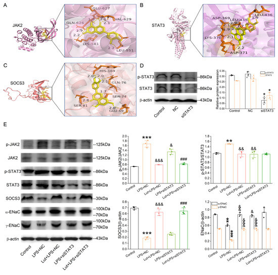 In order to verify the dependability of pathways and protein targets predicted by the network pharmacology and molecular docking simulations, we selected the key targets involved in the JAK/STAT pathway, including JAK2, STAT3, and SOCS3, for verification using Western blot assay. We knocked down STAT3 first in the primary AT2 cells, and the efficiency is shown in Figure 8D (p < 0.05 vs. Control group). LPS increased phospho-specific forms of JAK2 and STAT3 (Figure 8E, p < 0.001~0.01 vs. Control group), which were decreased after the Lut treatment (p < 0.001~0.01 vs. LPS + NC group), and the former was not affected by the knockdown of STAT3. Meanwhile, the LPS-reduced SOCS3 expression (p < 0.001 vs. Control group), a negative feedback regulator of JAK/STAT pathway, was inhibited by Lut with or without STAT3 knockdown (p < 0.001 vs. LPS + NC group or LPS + siSTAT3 group). As shown in Figure 8E, compared with that in Control, the α/γ-ENaC expression level in the LPS-treated AT2 cells was dramatically suppressed (p < 0.01~0.001 vs. Control group) and remarkably elevated by either the treatment of Lut or the lack of STAT3 (p < 0.001~0.05 vs. LPS + NC group). Intriguingly, the Lut-enhanced α/γ-ENaC expression was abolished after the co-administration of the STAT3 knockdown.