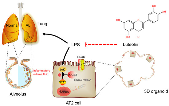 A schematic diagram for Lut to enhance the expression of ENaC in LPS-induced ALI. Lut can interdict the effect of LPS by increasing the expression of ENaC mRNA and protein via JAK/STAT pathway, as well as inhibiting the secretion of inflammatory cytokines in LPS-induced ALI. ALI, acute lung injury; AT2, alveolar epithelial type 2; ENaC, epithelial sodium channel; LPS, lipopolysaccharide.