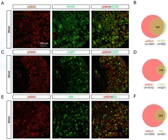 γH2AX was distributed in large peptidergic, small peptidergic, and nonpeptidergic neurons in different proportions. (A,C,E) Immunofluorescent images show the colocalization of γH2AX with NF200 (large myelinated neuron marker), CGRP (small peptidergic neuron marker), and IB4 (small nonpeptidergic neuron marker) in the DRG of sham-operated mice. Scale bar = 75 μm. (B,D,F) Venn diagrams showing the double staining of γH2AX with IB4, CGRP, and NF200.