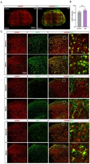 The spinal cord (SC) plays a crucial role in pain modulation, acting as a critical relay between peripheral nociceptors and the higher centers of the brain [16]. Therefore, we characterized the expression and cell distribution of γH2AX in SC. After SNI, there was no notable difference in γH2AX levels between the ipsilateral spinal dorsal horn three days post-surgery and the contralateral side (Figure 3A,B). To uncover the distribution of γH2AX in SC, we utilized markers for neurons (Neuronal Nuclei, NeuN), astrocytes (glial fibrillary acidic protein, GFAP), and microglia (IBA1) to conduct a double immunofluorescence with γH2AX on SC from mice 3 days after SNI. As shown in Figure 3A, the coexistence of γH2AX was observed with NeuN and IBA1, but not obviously with GFAP in the spinal cord, suggesting that neurons and microglia are the main sources of γH2AX in the area.