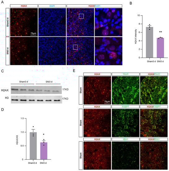 Considering the influence of H2AX on the level of γH2AX, we assessed the expression levels of H2AX in DRG tissue obtained from sham and SNI mice 3 days post-surgery. The immunofluorescence indicated that H2AX was co-localized with DAPI (Figure 4A), indicating that H2AX was mainly located in nucleus. Additionally, the fluorescence intensity of H2AX in DRG 3 days after SNI was significantly decreased compared with the sham group (Figure 4B). Consistent with the immunofluorescence result, the Western blot results confirmed the decrease in H2AX protein level (Figure 4C,D). Based on the results, it appears that the reduction in γH2AX in DRG due to SNI could be associated with a decrease in H2AX levels. To further investigate the localization of H2AX in DRG tissue, we performed the double-staining of H2AX with neuronal marker TUJ1, satellite cell marker fatty acid binding protein 7 (FABP7), and microglia marker IBA1. The results showed that H2AX was predominantly co-localized with TUJ1, rather than IBA1 or GFAP (Figure 4E), indicating that H2AX is mainly located in DRG neurons.