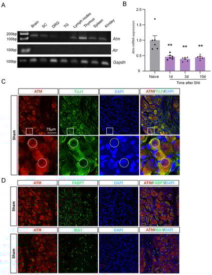 ATM expression was down-regulated in DRG neurons after SNI. (A) Gene expression profile of Gapdh, Atm, and Atr in brain, SC, DRG, trigeminal ganglion (TG), lymph nodes, thymus, spleen, and kidney. After 32 cycles of qPCR, the products of Gapdh, Atm, and Atr were detected using agarose electrophoresis. (B) Time-course of Atm mRNA expression in the DRG from naïve and SNI-operated mice. n = 6 mice per group. **, p < 0.01 versus the naive group. One-way ANOVA was followed by Bonferroni’s test. (C) Representative immunofluorescence images of ATM and TUJ1 with DAPI after sham surgery. The boxed region of the merged images was enlarged below. The dotted box selects the edge of the DAPI. Scale bar = 75 µm. (D) Representative immunofluorescence images of ATM and FABP7, and IBA1 with DAPI, after sham surgery. Scale bar = 75 µm.