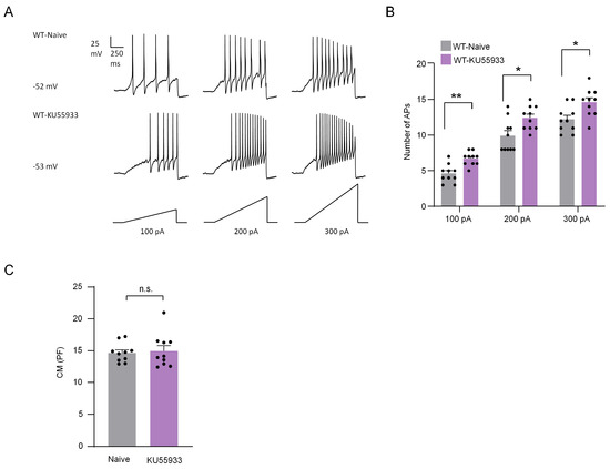 Neuropathic pain is closely related to the increased excitability and spontaneous activity of DRG neurons [18]. Thus, the effect of ATM on the electrophysiological activity of DRG neurons was explored via patch clamp recordings. DRG neurons were cultured in vitro and incubated with ATM inhibitor KU55933 (25 μM) for 10–12 h. We compared the action potentials (Aps) of DRG neurons between the control group and the group incubated with KU55933. In responding to 100 pA, 200 pA, and 300 pA ramp currents, the numbers of APs in naive group neurons were 4.60 ± 0.40, 9.90 ± 0.72, and 12.20 ± 0.57, respectively, while the numbers of Aps in KU55933-incubated DRG neurons were 6.70 ± 0.30, 12.40 ± 0.52, and 14.60 ± 0.62, respectively (Figure 7A,B), suggesting that the excitability of DRG neurons was increased by the inhibition of ATM. We further compared the membrane capacitance (CM) and found no significant difference after incubation with KU55933 compared to the control group (Figure 7C).