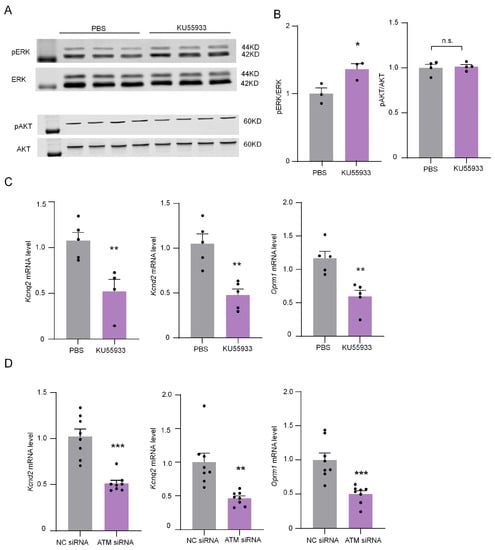 ERK/MAPK (mitogen-activated protein kinase) and AKT (protein kinase B) pathways are essential in mediating chronic pain [19,20]. The phosphorylation of ERK and AKT were detected by Western blotting after the intrathecal injection of ATM inhibitor for 6 h to explore their roles in the ATM inhibition-induced sensitization of neuropathic pain. The results show that ATM inhibited by intrathecal injection KU55933 (100 μM) notably up-regulated ERK phosphorylation but had no significant effect on the phosphorylation of AKT (Figure 8A,B), suggesting that ATM inhibited the ERK/MAPK pathway. Neuronal excitability is regulated by many genes, such as Kcnq2, Kcnd2, and opioid receptor mu 1 (Oprm1) [21,22,23], which blunts neurons excitability. The expression of Kcnq2, Kcnd2, and Oprm1 was dramatically down-regulated by ATM inhibitor or siRNA (Figure 8C), implying that ATM-induced sensitization of neuralgia pain was associated with the down-regulation of pain-inhibiting genes’ expressions.