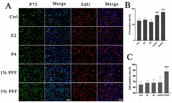 To investigate the biological effects of PFF and the hormones on FTECs, we first analyzed p73 expression and the proliferation rate by EdU assay in FTECs. FTECs were passaged and incubated in the presence of E2, progesterone (P4), and PFF for 24 h, respectively. A total of 5 μM Edu was added into each group and further incubated for another 24 h. Compared to the control, E2, and P4 groups, treatment with 1% and 5% PFF in FTECs led to a significant increase in p73 expression, a progenitor maker expressed in FTECs (Figure 1A,B). In addition, EdU-positive cells in the group of 5% PFF were significantly greater than other groups (Figure 1A,C), suggesting that PFF may enhance cellular proliferation. These results indicate that FF may increase the growth rate of primary FTECs, but generally, it does not affect precursor cells and retain the differentiation potential of FTECs.