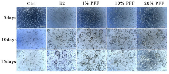 Phase contrast images of spheroid formation and growth: The organoids were cultured with basal medium and in the absence (Ctrl) and presence of 2 ng/mL E2, 10 nM P4, and PFF (1%, 10%, 20%), respectively. Small spheres are already visible 2 days after seeding and expand to reach a diameter of over 100 mm within 10 days. Images were taken after being cultured for 5, 10, and 15 days. Scale bars: 500 µm.