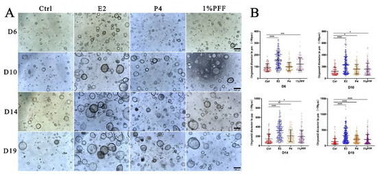 The hormones and PFF on the size and number of the organoid spheroids: (A) The organoids were cultured with basal medium in the absence (Ctrl) and presence of 2 ng/mL E2, 10 nM P4, and 1% PFF, respectively. Images were taken by a phase contrast microscope after being cultured for 6, 10, 14, and 19 days. The number and size of spheres with diameters greater than 50 μm were counted. Scale bars: 500 µm. (B) Quantitation of number and size of organoid spheres presented in (A). The data points represent the diameter of organoids measured in micrometers, and the median values with interquartile range are displayed for indicated culture conditions. Statistical significance was determined using one-way ANOVA tests and compared with control group. Significance level: * p < 0.05, ** p < 0.01, *** p < 0.001, and **** p < 0.0001.