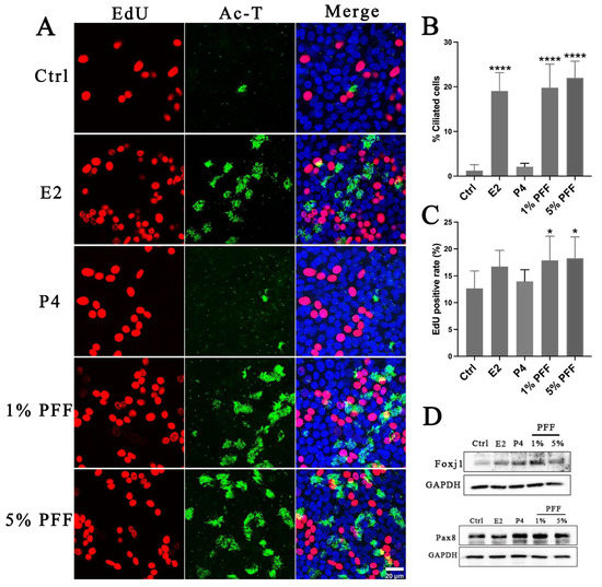 Effects of hormones and PFF on FTEC differentiation and self-renewal: (A) FTECs were cultured with the basal medium in the absence (Ctrl) and presence of E2 (2 ng/mL), P4 (10 nM), and PFF (1%, 5%), respectively, and exposed to ALI culture conditions for 10 days. EdU (5 µM) was added to basal chambers on ALI day 10. Differentiated cells were cultured with EdU for 48 h. Fixed cells were stained with anti-Ac-tubulin antibody (green) and DAPI (blue) and processed for EdU staining (red). Scale bars: 20 µm. (B) The numbers of ac-tubulin-positive cells were quantified (one-way ANOVA tests, n = 7, compared with Ctrl group), **** p < 0.0001). (C) The number of EdU-positive cells calculated in each medium (one-way ANOVA tests, n = 7, compared with Ctrl group). Significance level: * p < 0.05). (D). Western blot analysis of Foxj1 and Pax8 expression in FTECs after treatment by indicated hormones and PFF. FTECs were cultured with the basal medium in the absence (Ctrl) and presence of E2 (2 ng/mL), P4 (10 nM), and PFF (1%, 5%), respectively, and exposed to ALI culture conditions for 5 days.