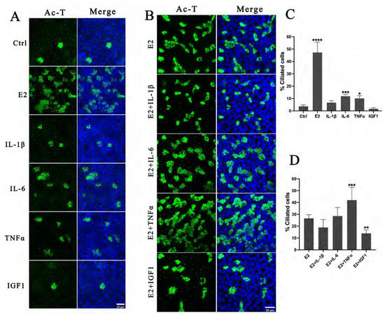 FF also contains many factors that modulate oocyte maturation and ovulation, such as various growth factors and cytokines, in addition to hormones. To elucidate the effect of these factors on the differentiation of FTECs, we examined the differentiation status of FTECs induced by several cytokines. For this purpose, FTECs were incubated with IL-1β, IL-6, TNFα, and IGF-1 in ALI conditions for 10 days, but we found that these factors alone failed to induce ciliogenesis compared with E2 (Figure 5A,C). When FTECs were treated by IL-1β, IL-6, TNFα, and IGF-1 in the presence of E2, only TNFα and estrogen exhibited a weak synergistic effect on ciliogenesis (Figure 5B,D). This observation suggests that E2 is indispensable for ciliogenesis, which is consistent with our previous study [3].