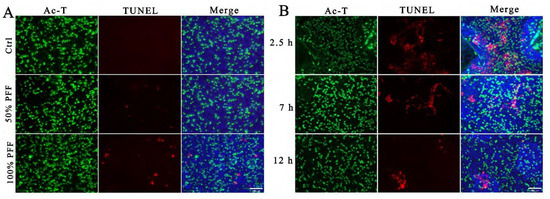 Simulating the direct stimulation of the oviduct epithelium by FF: FTECs were incubated in basal medium supplied with E2 (2 ng/mL) and exposed to ALI condition for 15 days. (A) Differentiated FTECs in the upper chambers were directly exposed to DMEM/F12, 50% PFF, or 100% PFF for 30 min; cells were then fixed and stained with anti-Ac-tubulin antibody (green) and DAPI (blue), and processed for TUNEL staining (red). Scale bars: 100 µm. (B) Differentiated FTECs in the upper chambers were directly exposed to 100% PFF for 2.5 h, 7 h, and 12 h, respectively. Cells were then fixed and stained with anti-Ac-tubulin antibody (green) and DAPI (blue) and processed for TUNEL staining (red). Scale bars: 100 µm.