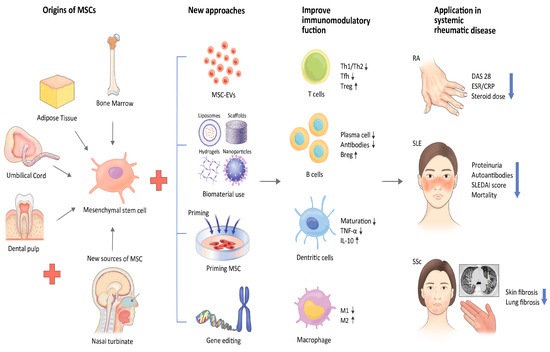 Systemic rheumatic diseases such as rheumatoid arthritis (RA), systemic lupus erythematosus (SLE), and systemic sclerosis (SSc) are inflammatory conditions associated with immune system dysregulation. RA is a chronic systemic disease primarily affecting the musculoskeletal system, including joints, tendons, and other connective tissues, significantly reducing the quality of life of those affected [1]. Significant advancements have been achieved in the field of targeted therapies for RA over the last decade. In recent times, there has been a notable expansion in the range of treatment options for RA. This includes biological or targeted synthetic disease-modifying antirheumatic drugs (b/tsDMARDs) such as anti-TNF-α blockers, abatacept, tocilizumab, and Janus kinase inhibitors. These therapies have demonstrated remarkable effectiveness in managing the symptoms and progression of RA. However, despite the advancements, the effectiveness of these therapies may still be suboptimal in certain patients. Additionally, the use of these therapies can be associated with significant risks, such as an increased susceptibility to infections and malignancies. As a result, there is an ongoing need to explore and develop novel treatment alternatives for RA to address these limitations and provide better outcomes for patients [2]. SLE is an autoimmune disorder characterized by auto-antibodies targeting nuclear and cytoplasmic antigens. This disorder causes inflammation in multiple systems and has diverse clinical symptoms, with an unpredictable disease course involving flare-ups and improvement [3]. At present, the primary treatment approaches for SLE involve the use of corticosteroids and immunosuppressants. However, long-term remission is achieved by only a few patients. Importantly, immunosuppressive therapies often fail to prevent disease relapse in more than half of the patients, and high-dose treatments can even increase the risk of severe infections and mortality. Given the unmet medical needs associated with SLE, which include inadequate disease control, diminished health-related quality of life, comorbidities, the toxicity of most therapies, and reduced survival, there is a critical need for new therapeutic agents to address these challenges [4]. SSc is a rheumatic disease where the body’s immune system inadvertently damages small blood vessels, causing widespread fibrosis in the skin and internal organs. This condition can result in various clinical symptoms, ranging from minor issues such as Raynaud’s phenomenon and fatigue to more severe complications, including pulmonary arterial hypertension and lung fibrosis [5]. An important factor contributing to poor prognosis in patients with SSc is the abnormal accumulation of collagen in the skin and various organs, including the lungs, heart, and kidneys. Unfortunately, fibrosis, characterized by this excessive collagen deposition, is typically irreversible. Currently, there is a lack of available treatment options for SSc that are both safe and effective in managing fibrosis in the affected organs. Systemic rheumatic diseases have complex pathophysiology and diverse symptoms. Therefore, conventional treatments may not be effective for cases with poor prognoses, leading to irreversible disability and organ damage. Cellular therapies have been developed with the aim of restoring immunologic self-tolerance, with the goal of achieving long-lasting remissions or promoting tissue regeneration. The recently investigated mesenchymal stem/stromal cell (MSC)-based therapy is promising in treating systemic rheumatic disease. MSCs are easily isolated and cultured in vitro, and their immune privilege allows for transferring allogeneic cells to patients.