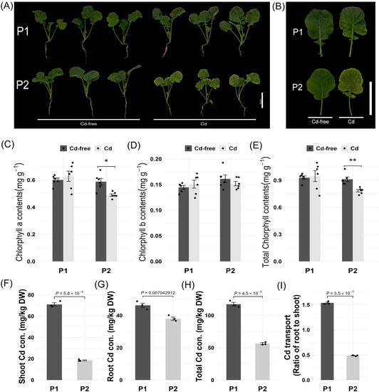 Morphology and Cd (cadmium) accumulation of Cd-enriched (‘P1’) rapeseed line and low-Cd-accumulation (‘P2’) rapeseed line under Cd2+ treatment. (A) Morphology of the Cd-enriched (‘P1’) rapeseed line and low-Cd-accumulation (‘P2’) rapeseed line under Cd-free (control) and 5 mg/kg Cd2+ treatment. Scale bars = 10 cm. (B) Images of leaves of the Cd-enriched (‘P1’) and low-Cd-accumulation (‘P2’) rapeseed lines under Cd-free (control) and 5 mg/kg Cd2+ treatment. Scale bars = 10 cm. (C–E) Chlorophyll content of Cd-enriched (‘P1’) and low-Cd-accumulation(‘P2’) rapeseed lines under Cd-free (control) and 5 mg/kg Cd2+ treatment. Error bars represent the SE values, * p < 0.05, ** p < 0.01 unpaired t-test; n = 6. (F–H) Cd2+ concentrations in the shoot, root, and whole plant of ‘P1’ and ‘P2’. (I). Cd transport ratio from root to shoot in ‘P1’ and ‘P2’. Error bars represent the SE values; p values for statistical significance are shown as determined by paired t-test; n = 3.