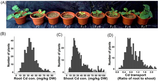 Growth performance and Cd accumulation of F2 individuals under Cd2+ treatment. (A) Growth performance of P1, P2, and F2 individuals under 5 mg/kg Cd2+ treatment. (B) Frequency distribution of Cd2+ concentrations in shoots of F2 individuals. (C) Frequency distribution of Cd2+ concentrations in roots of F2 individuals. (D) Frequency distribution of the Cd2+ transport ratio of F2 individuals.