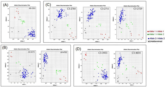 Genotyping results of 89 low-cadmium-accumulation F2 individuals on chromosome C03 and chromosome A09. The red dots are cadmium-enriched genotypes, the green dots are heterozygotes, and the blue dots are the low-cadmium-accumulation genotypes; × is the result of invalid genotyping. (A) The KASP detection results of QTL Cd-en-qtl1 on chromosome A09. (B) The KASP detection results of QTL Cd-en-qtl2 on chromosome A09. (C) The KASP detection results of QTL Cd-en-qtl6 on chromosome C03. (D) The KASP detection results of QTL Cd-en-qtl7 on chromosome C03.