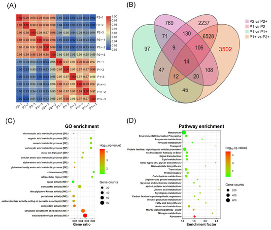 Overview of RNA-sequencing data for the Cd-enriched and low-Cd-accumulation lines. (A) Correlation analysis of the RNA-seq samples. ‘P2+’ and ‘P2’ represent the low-Cd-accumulation line with and without 5 mg/kg Cd2+ treatment, respectively; ‘P1+’ and ‘P1’ represents the Cd-enriched rapeseed line with and without 5 mg/kg Cd2+ treatment, respectively. (B) Venn diagrams for DEGs in ‘P1+’ compared with ‘P1’, ‘P2’, and ‘P2+’. (C) GO term enrichment analysis of 3502 DEGs. (D) KEGG pathway enrichment analysis of 3502 DEGs.