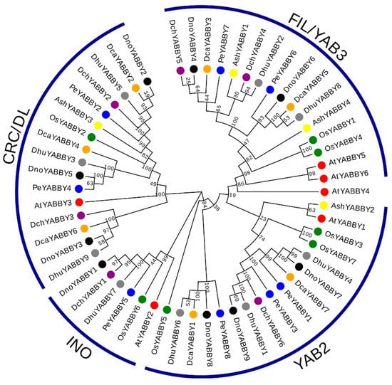 The amino acid sequences of six YABBY proteins of D. chrysotoxum, nine YABBY proteins of D. huoshanense, nine YABBY proteins of D. nobile, six YABBY proteins of A. thaliana, seven YABBY proteins of O. sativa, four YABBY proteins of A. shenzhenica, seven YABBY proteins of D. catenatum, and eight YABBY proteins of P. equestris were introduced into the MEGA 7.0 software. The total 56 sequences were aligned using ClustalW with the default parameters. To construct a neighbor-joining (NJ) phylogenetic tree of the YABBYs, the bootstrap method was performed with 500 replicates and the partial deletion was set to 50%. For better visualization, the NJ phylogenetic tree was processed using the online software Evolview 3.0 (http://www.evolgenius.info/evolview/#/treeview, accessed on 12 December 2022).