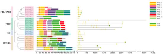 To observe the gene structure of the YABBY genes in Dendrobium, ten conserved motifs were predicted through the MEME program, and the exon–intron structures were exhibited using Tbtools (Figure 2). The results show that most of the YABBY genes had four conserved motifs in the order of motifs 8, 2, 3 and 1. In addition, YABBY family members in the same subfamily had similar conserved motifs, and had certain specific motifs which were not found in the other subfamilies. Motif 9 was observed only in FIL/YAB3 and motif 6 was peculiar to YAB2. The INO subfamily possessed motif 10 exclusively and motif 7 only existed in the CRC/DL clade. Interestingly, motif 5 was present in two clades (YAB2 and CRC/DL), while motif 4 appeared in all clades except the YAB2 clade. Further, almost all the YABBY genes harbored at least four conserved motifs, while DchYABBY4 and DhuYABBY9 contained three conserved motifs, and DchYABBY5 and DhuYABBY6 had only two motifs.