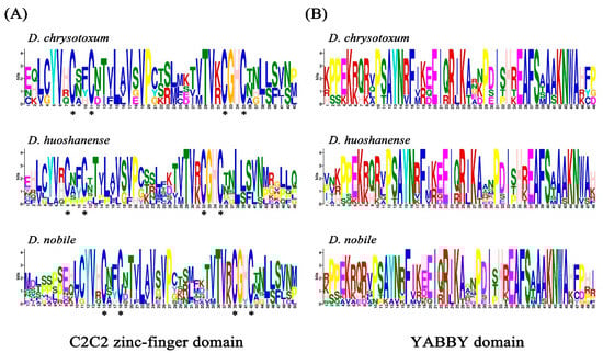 Sequence logos of the C2C2 zinc-finger and YABBY domains in the three Dendrobium species were generated by multiple sequence alignments. As shown in Figure 3, these two domains were highly conserved. The C2C2 zinc-finger domain (Figure 3A) had serval significantly conserved amino acid residues, including cysteine residues (C), glycine residues (G), histidine residues (H), and valine residues (V). In the YABBY domain (Figure 3B), most of the amino acid residues were extremely conserved.