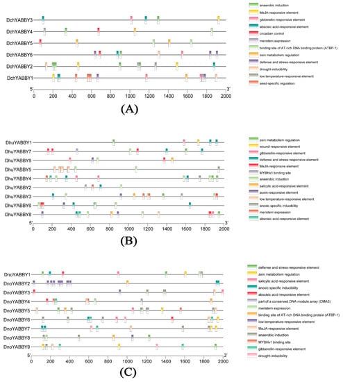A large number of cis-acting regulatory elements in the promoters of DchYABBYs, DhuYABBYs, and DnoYABBYs were obtained. The most frequently occurring responsive elements in the upstream sequence of D. chrysotoxum included Methyl Jasmonate (MeJA)-responsive elements (8 times), anaerobic induction (ARE)-responsive elements (8 times), and abscisic acid-responsive elements (7 times) (Figure 4A). However, a low temperature-responsive element only appeared once in DchYABBY2. It is noteworthy that all four seed-specific regulation elements appeared in the 400–600 bp upstream CDS of DchYABBY1. In Figure 4B, similar to the cis-acting regulatory elements in D. chrysotoxum, both the MeJA-responsive elements and ARE elements were observed most frequently. DhuYABBY8 had the largest number of cis-acting regulatory elements (14), followed by DhuYABBY4 (12). DhuYABBY2 contained the least number with only four elements. A wound-responsive element was solely present in DhuYABBY1. The largest number of elements were found in DnoYABBY5 (fourteen elements), while DnoYABBY8 had the fewest (six elements) (Figure 4C). Interestingly, low temperature-responsive elements mainly appeared in the 0–500 bp upstream CDS of DnoYABBY2. Generally, all three Dendrobium species had AREs, MeJA-responsive elements, gibberellin-responsive elements, abscisic acid-responsive elements, meristem expression, zein metabolism regulation, and low temperature-responsive elements, suggesting the wide functional variability of the YABBY genes in Dendrobium.