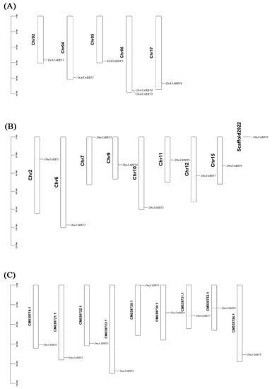 As shown in Figure 5A, six DchYABBYs were distributed on five chromosomes of D. chrysotoxum (Chr02, 04, 05, 06, and 17). Chromosome 06 had two genes (DchYABBY4 and DchYABBY5), while the other chromosomes each contained one gene. The chromosome mapping results for D. huoshanense indicated that eight DhuYABBYs were unevenly distributed on Chromosomes 2, 6, 7, 9, 10, 11, 12, and 15 (Figure 5B). DhuYABBY9 was localized to the unanchored scaffold, named Scaffold2022. Nine DnoYABBYs were present on nine chromosomes. Only DnoYABBY5 was localized on the top of CM039729.1 (Figure 5C).