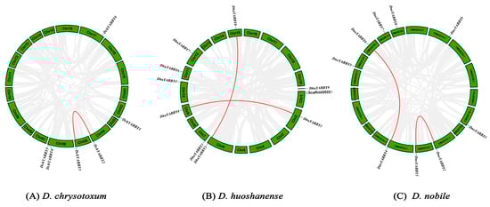 Synteny analysis of the YABBY genes in the three Dendrobium species. (A) Synteny analysis of DchYABBY genes. (B) Synteny analysis of DhuYABBY genes. (C) Synteny analysis of DnoYABBY genes. Red lines represent segmental duplicated gene pairs.