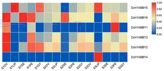 According to the FPKM values, the expression levels of six DchYABBYs in different parts and developmental periods (Figure 7) suggest the higher expression of DchYABBY2, 3, 5, and 6 in the S1 stage than in the other two stages. DchYABBY1 showed high expression in the ovary in the S2 stage, and DchYABBY4 was only expressed in the lip in the S3 stage. DchYABBY2 and DchYABBY3, both belonging to the CRC/DL subfamily, exhibited similar expression patterns throughout flower development. DchYABBY5 was highly expressed in the lip and gynostemium in the S1 stage, while DchYABBY6 showed high expression in the ovary, sepal, and petal in the S1 stage.