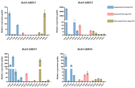Real-time fluorescence quantitative expression analysis of DchYABBYs in flower development. The blue bars represent the relative expression of five flower parts in the S1 stage, the pink bars represent the relative expression of five flower parts in the S2 stage, the olive-green bars represent the relative expression of five flower parts in the S3 stage. The raw data are listed in Supplementary Table S5.