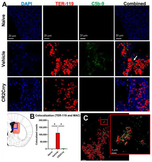 Following GMH, CR2-Crry treatment decreases C5b-9 (MAC) and TER-119 (RBC) colocalization in the injury region acutely at P7. (A) Representative IF images for naïve mice, and vehicle-treated or CR2-Crry-treated GMH mice, showing DAPI (blue), TER-119 (red), and C5b-9 (green) and merged TER-119/C5b9 merged images, with increased colocalization within the vehicle image (white arrow). (B) Quantification of voxel-based C5b-9 and TER-119 colocalization. One-way ANOVA with Bonferroni’s correction for multiple comparisons. * p < 0.05. n = 5 for naïve, n = 9 for vehicle, and n = 9 for CR2-Crry. Error bars = mean ± SEM. (C) Representative 3D reconstructed image of a brain section from a vehicle-treated GMH mouse, demonstrating surface coverage of RBCs (red) with C5b-9 (green).