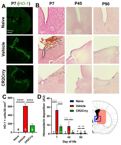 We first investigated the role of complement in RBC breakdown acutely after GMH. In vehicle-treated GMH mice at P7 (3 days postinjury), the timepoint representing an early post-hemorrhagic state, MAC (C5b-9) deposition was found to colocalize with RBCs (TER-119) (Figure 1). Little or no MAC was detected in naïve mice or GMH mice treated with CR2-Crry (Figure 1A,B). A representative image of colocalized MAC and TER-119 is shown in Figure 1C. To note, TER-119 staining in the CR2-Crry group is weaker than in the vehicle group. This may be due to reduced MAC-mediated lysis leading to increased RBC phagocytosis and removal. The tissue surrounding the hemorrhage in vehicle-treated GMH mice at P7 contained an increase in heme oxygenase 1 (HO-1)-positive cells, indicating increased heme-related cellular stress (Figure 2A,C). Perls Prussian blue staining also revealed acute heme and iron deposition (hemosiderin) along the edges of the injury site in GMH mice at P7, which was significantly reduced by CR2-Crry treatment (Figure 2B,D). By P45, iron deposition was significantly reduced compared to P7 in vehicle-treated GMH mice but remained significantly higher than in CR2-Crry-treated mice. At P90, there was no evidence of iron deposits in any of the groups.