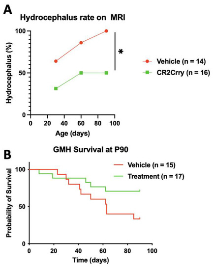 Following GMH, CR2-Crry treatment improves survival and reduces the progressive hydrocephalus rate measured through P90. (A) Hydrocephalus (Scale 5 injury) was determined by MRI at P30, P60, and P90; n = 14 for the vehicle and n = 16 for CR2-Crry. The percentage refers to the total number of animals in each group. (B) Survival as assessed over 90 days period. Animals that died within the first 24 h of GMH injury were excluded from the analysis. Survival rates were 70% in the CR2-Crry group compared to 33% in the vehicle (p < 0.05). Log-rank (Mantel–Cox) test. * p < 0.05. n = 15 for vehicle and n = 17 for CR2-Crry.