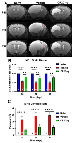 Magnetic resonance imaging (MRI) was performed at P30, P60, and P90 to evaluate the evolution of hydrocephalus over time. At P30, the rate of hydrocephalus was 64% and 31% in the vehicle and CR2-Crry-treated groups, respectively (Figure 3A). At P90, 100% of vehicle-treated animals had progressed to hydrocephalus, whereas the hydrocephalus rate plateaued at 50% for CR2-Crry-treated animals (Figure 3A). At P90, the survival rate was 70% for CR2-Crry-treated GMH mice, but only 33% for vehicle-treated GMH mice (Figure 3B). Animals that died prior to the first MRI were excluded from hydrocephalus analysis. Animals that were diagnosed with hydrocephalus at the P30 MRI and subsequently died prior to the P60 or P90 MRI were included in the overall hydrocephalus groups at P60 and P90. The assumption was made that hydrocephalus would not reverse over time. Of the surviving animals, none had a reversal of hydrocephalus once developed. MRI analysis was also used to quantify the ventricular volume and remaining brain tissue (Figure 4A). Quantitative analysis of MRI images shows a significantly higher brain-tissue-to-head circumference ratio in naïve and CR2-Crry groups compared to vehicle-treated mice at all three timepoints (Figure 4B). The ventricular size was significantly larger in the vehicle group compared to the naïve and CR2-Crry groups (Figure 4C). A qualitative examination of images at P30, P60, and P90 show worsening of the pre-existing hydrocephalus in the vehicle group, with evidence of transependymal flow (shown by a red asterisk in Figure 5A) and effacement of the surrounding brain tissue. In contrast, CR2-Crry-treated animals develop a stable injury with the minimal progression of the injury or effacement of the periventricular brain structures (Figure 4A).