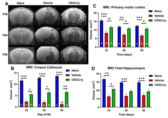 While present acutely after GMH, RBCs are cleared from the brain and CSF within a few days. Mechanisms of heme-related inflammation include activation of TLR-4 and increased expression of TNFα and various interleukins [22]. Prolonged iron-induced inflammation leads to PHH and PVL. PVL is a diagnosis that includes clinical, MRI, and histological findings [44,45]. Clinical findings include cerebral palsy, spasticity, and neurocognitive delay. Imaging-based findings of PVL include cerebral white-matter loss, thinning of the corpus callosum, loss of cortical motor areas, and hippocampal atrophy [46]. Histologic findings include glial scar formation and persistent white-matter inflammation [46,47]. In this study, MRIs performed at 30-day intervals after GMH revealed significantly reduced brain tissue in vehicle-treated animals compared to naïve and CR2-Crry-treated animals. In addition, ventricular size remained significantly higher in vehicle-treated animals compared to the other two groups. In addition, the corpus callosum volume was smaller in vehicle vs. naïve and CR2-Crry groups. Although measurements of the primary motor cortex did not reveal any differences between vehicle and CR2-Crry-treated animals at P30, differences did become significant at P60 and P90. On the other hand, there was a difference in hippocampal size between vehicle and CR2-Crry-treated animals at P30 but not at P60 and P90. Histological analysis of clinical samples has also shown that hippocampal morphology is affected, together with substantial neuronal loss and gliosis [46]. The reduced hippocampal size associated with prematurity has been connected to significant memory deficits on objective testing [48]. Furthermore, studies have shown diffuse white and gray matter abnormalities in preterm infants, irrespective of size, may be associated with worse cognitive outcomes and with the development of seizure disorders [49,50,51].