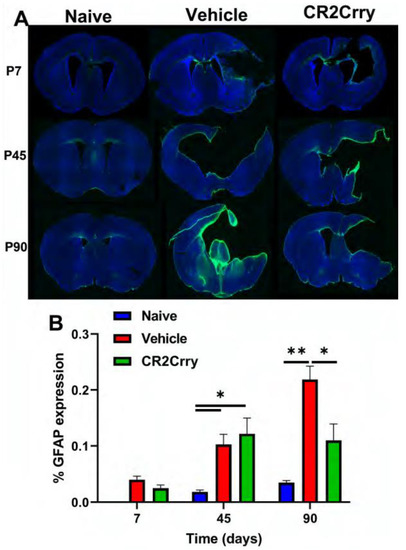 Periventricular astrocytosis is mitigated by CR2-Crry treatment at chronic timepoints after GMH. (A) Representative images of GFAP-stained sections from naïve, vehicle-treated, and CR2-Crry-treated animals at P7, P45, and P90. (B) Quantification of astrocytosis. * p < 0.05, ** p < 0.01. Error bars = mean ± SEM. n = 4 for naïve, n = 12 for vehicle, n = 15 for CR2-Crry.