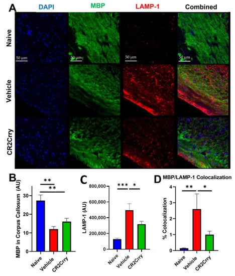 To evaluate white-matter degradation and phagocytosis, we stained for myelin basic protein (MBP) and the lysosomal marker LAMP-1 at P90 (Figure 7A). There was a reduction in MBP in the corpus callosum in both CR2-Crry- and vehicle-treated GMH animals as compared to naïve animals (Figure 7B). However, the opposite was true for LAMP-1 expression, which was higher in the corpus callosum white matter in vehicle- and CR2-Crry-treated animals compared to naïve animals, and with LAMP-1 expression significantly lower in CR2-Crry-treated vs. vehicle-treated animals (Figure 7C). Furthermore, the level of colocalization of MBP and LAMP-1 was higher in vehicle-treated animals compared to both naïve and CR2-Crry-treated animals, indicating increased phagocytosis of white matter (MBP) in vehicle-treated mice (Figure 7D).