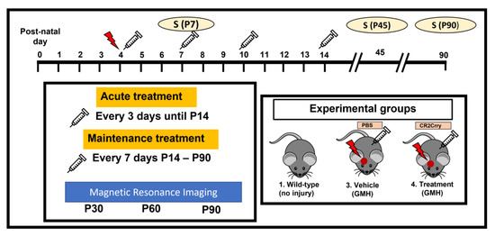 Study design. The study design is summarized in Figure 8. Animal groups in this study were: wildtype naïve (no GMH), vehicle (GMH with intraperitoneal PBS treatment), and CR2-Crry (GMH with intraperitoneal CR2-Crry treatment). Animal breeders and litters were randomly assigned to each of the three groups. A single individual performed all surgeries and treatments, and all GMH injuries were performed by guided injection of collagenase into the subventricular zone (SVZ) on postnatal day 4 (P4), as previously described [29]. Testing and scoring were blinded to group randomization for the duration of the study. Study endpoints were survival, and P7 (3 days postinjury), P45 (41 days postinjury), and P90 (86 days postinjury) for histopathological and immune analysis. For live-animal magnetic resonance imaging (MRI), we performed imaging at P30, 60, and 90 in order to obtain serial imaging for comparison. For the P45 and P90 cohorts, animal genders were identified for animals surviving to P8 (not possible sooner). In the vehicle group, there were 9 females and 6 males. In the CR2-Crry group, there were 9 females and 8 males. In the naïve group, there were 4 males and 4 females.