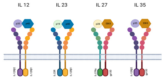 The family of interleukin 12 includes IL 12, IL 23, IL 27, and IL 35. Each one is made up of different subunits, including p19, p28, p35, p40, and EBI3. These subunits interact with various receptors and receptor chains.