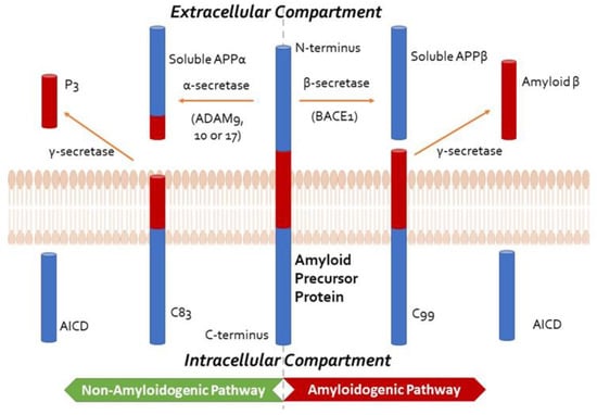 Both Aβ and hyperphosphorylated tau protein are involved in AD pathogenesis, although their respective impacts are debated [20,21]. The amyloid hypothesis is currently the most widely accepted hypothesis for the pathogenesis of AD. It proposes that brain accumulation and aggregation of Aβ peptides resulting from abnormal APP processing is the main cause of AD [22]. APP can be processed via the non-amyloidogenic pathway (cleaved by α-secretase) or the amyloidogenic pathway (cleaved by β-secretase) (Figure 1). The amyloidogenic pathway leads to a build-up of Aβ plaques, contributing to neuroinflammation and subsequent cell death. Aβ peptides can also deposit around the cortical and leptomeningeal vasculature, which is termed cerebral amyloid angiopathy, contributing to microvascular dysfunction, neurovascular unit disintegration, and dysfunction of the blood–brain barrier [23,24]. According to the AD ‘vascular hypothesis’, Aβ peptide-associated vascular disruption is thought to contribute to neuroinflammation and chronic hypoperfusion, leading to impaired Aβ clearance and possibly triggering increased cerebrovascular Aβ production and aggregation [23]. Although the extent of vascular disruption in AD pathogenesis is unclear, hypertension and diabetes have been shown to significantly increase the risk of developing AD [25].